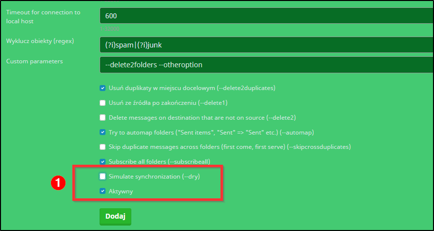 I tu ważna opcja. Odhaczamy symulacje. Domyślnie jest 'zahaczona'. Sprawdzamy czy Aktywny też jest 'zahaczony' i zatwierdzamy.